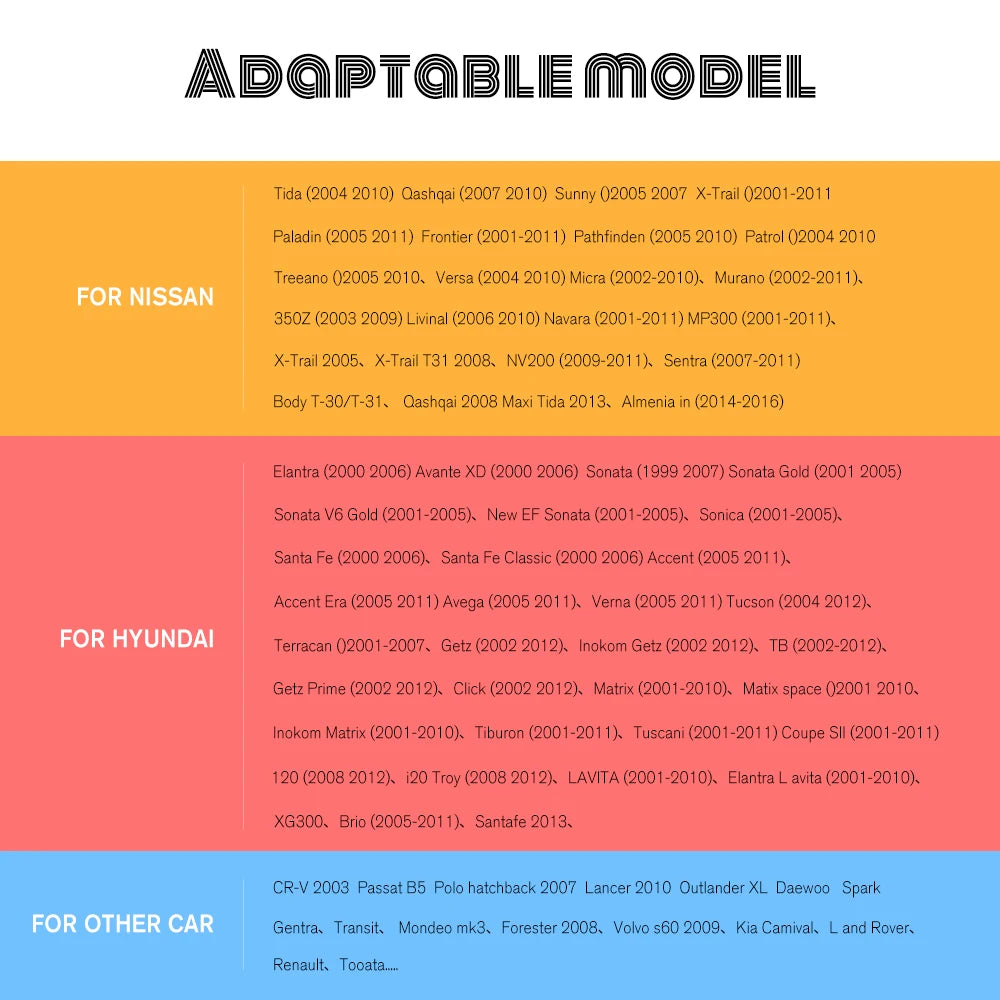 Suitable Vehicle Type: for VW Toyota Honda Hyundai Nissan Kia Unviersal